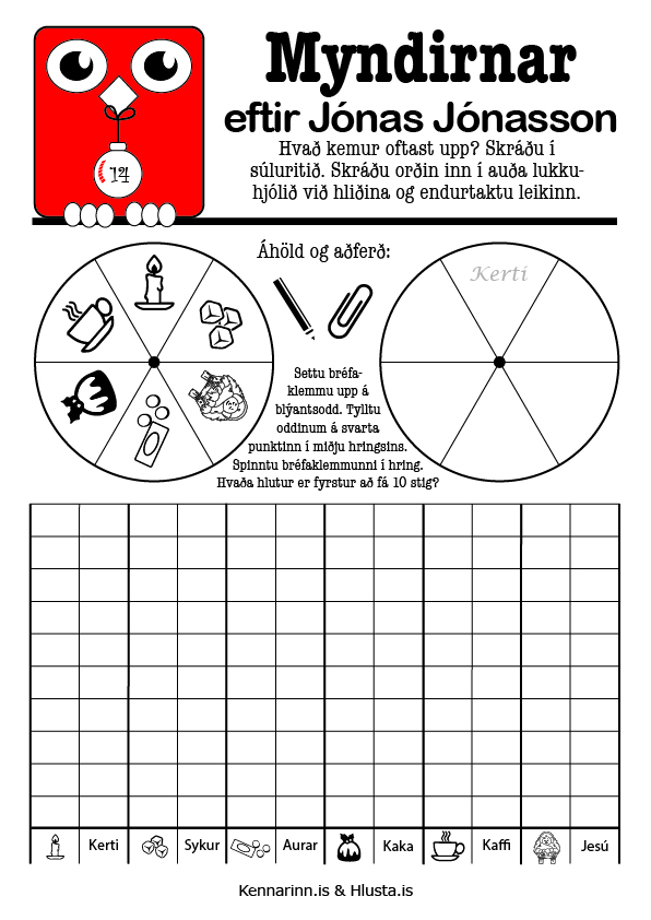 Í meðfylgjandi PDF skjali eru fjögur verkefni: Skýringarmyndir, súluritið, KVL kortið (nemendur klippa upp í kortið eftir punktalínunum, útbúa þannig flettiflipa og setja lím undir reitinn með textanum Sagan um Jesúbarnið. Loks er KVL kortið límt í stílabók fyllt út.) og hugtakakort. Verkefnin er hægt að sjá hér fyrir neðan en til að nálgast PDF eintak í hæfilegri prentupplausn þarf að velja skjalið 14. desember - Myndirnar PDF.